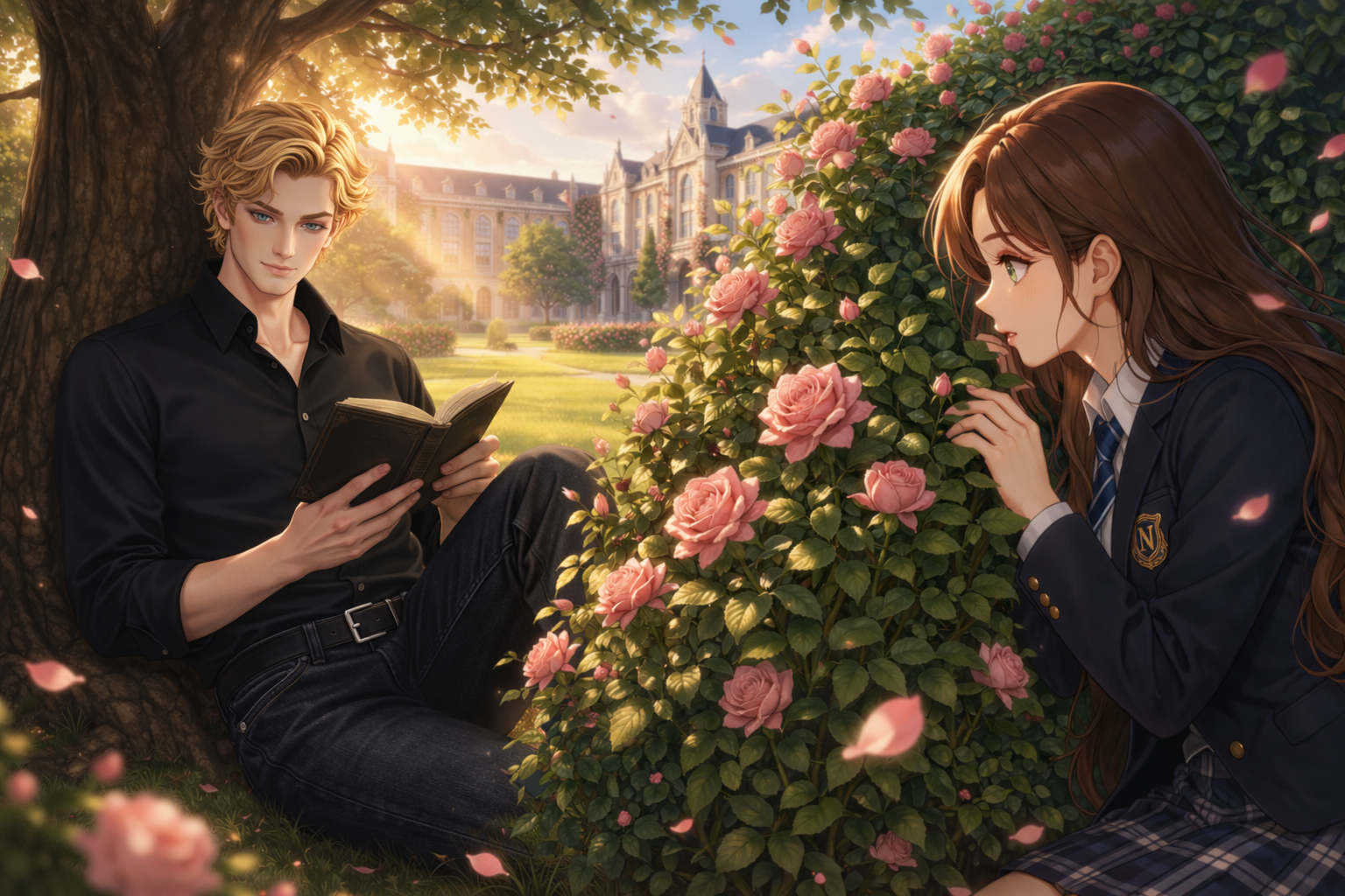Denerwuje mnie, że mi przeszkodził. Jego wygląd kontrastuje z księciem z bajki, a jednak, to właśnie on jest głównym bohaterem powieści i szkolnym idolem. Ma atletyczną sylwetkę, ciemnobrązowe włosy i bursztynowe oczy. Bez problemu mógłby zostać aktorem w komedii romantycznej. Im dłużej przebywa obok mnie, tym bardziej go nie lubię.