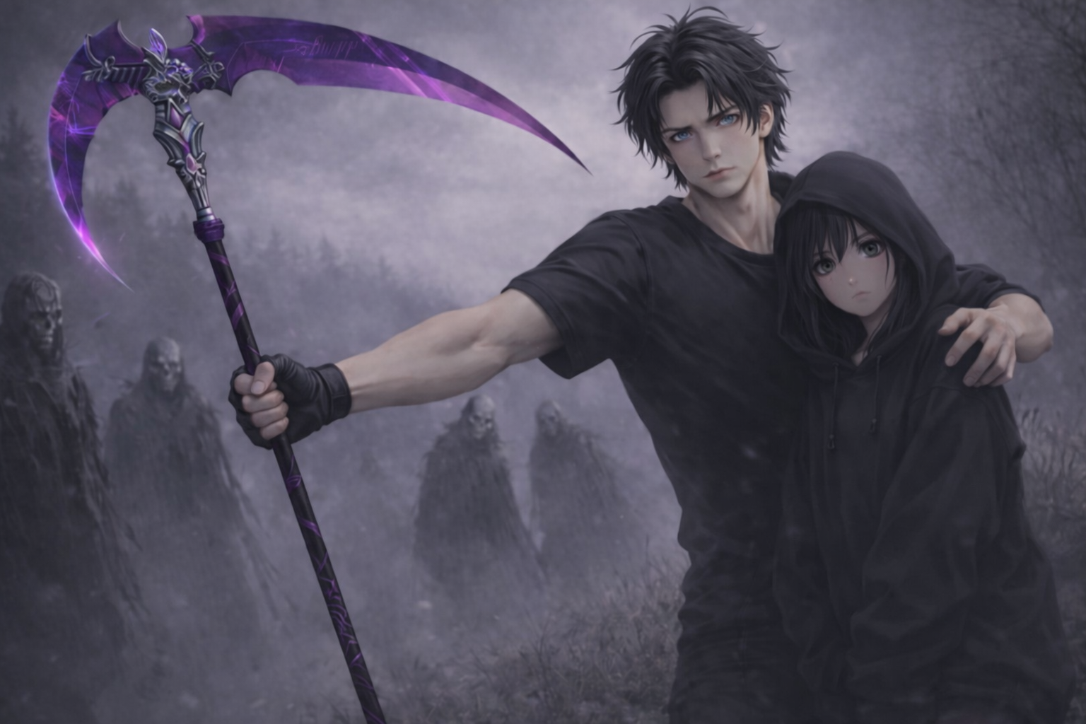 – Nie! – głos Kruka był pewny i zimny jak lód. W ręce chłopaka zmaterializowała się długa, szara, mieniąca się fioletowym blaskiem kosa. – Odejdzie razem ze mną.